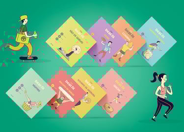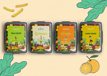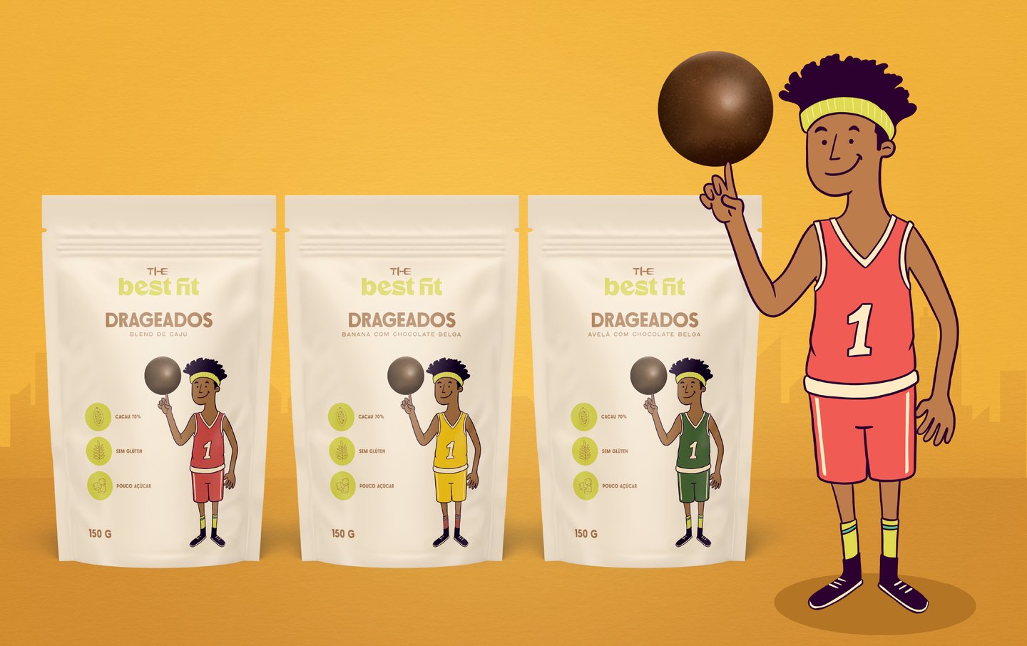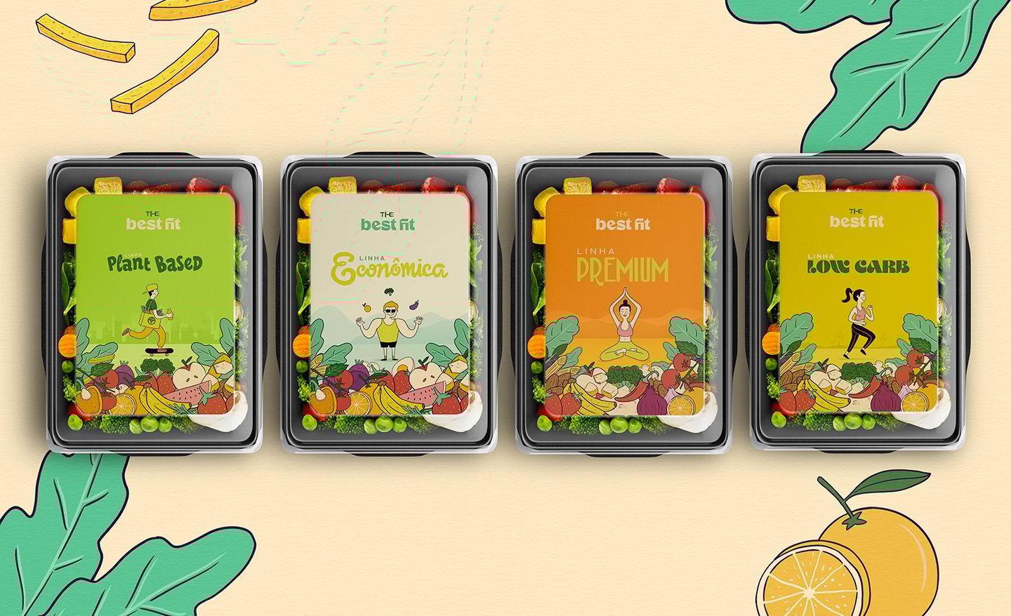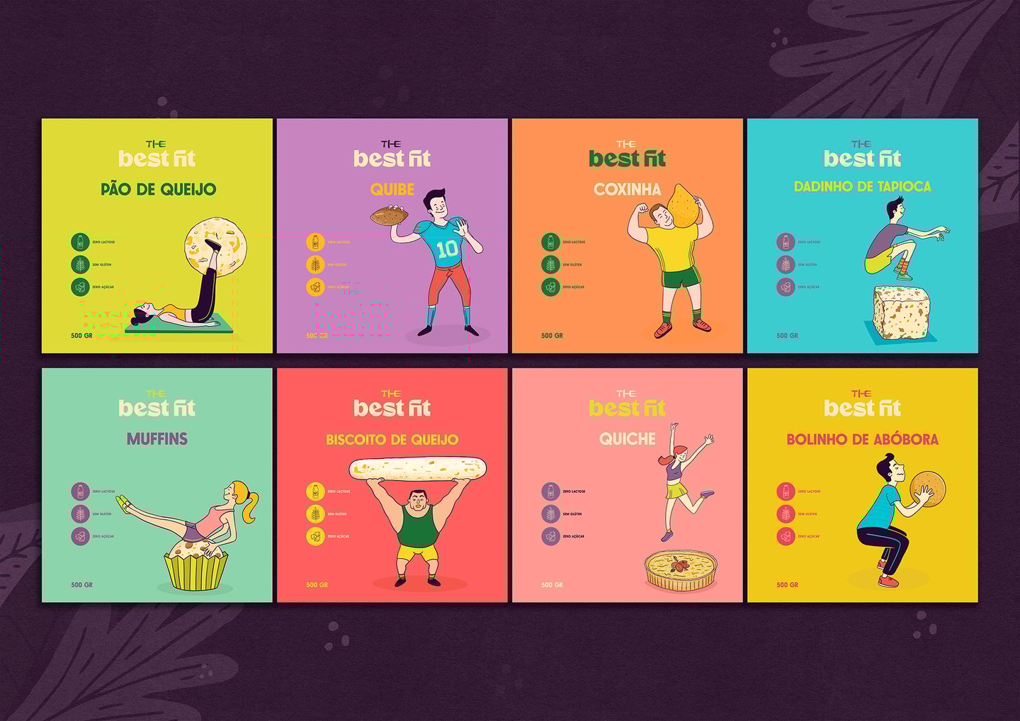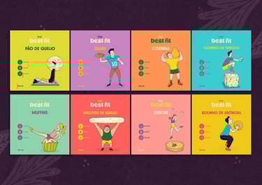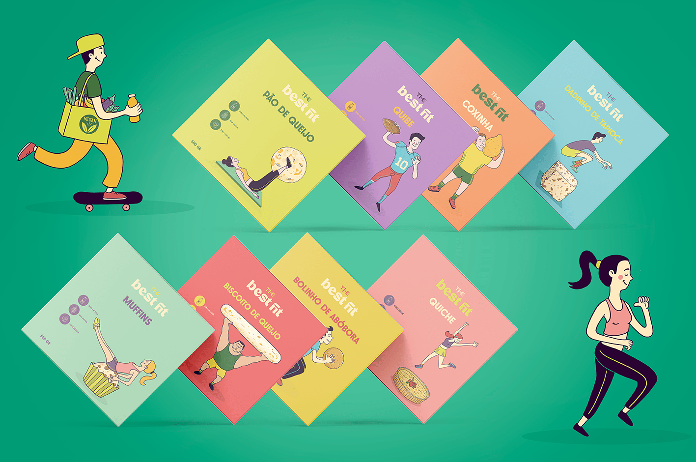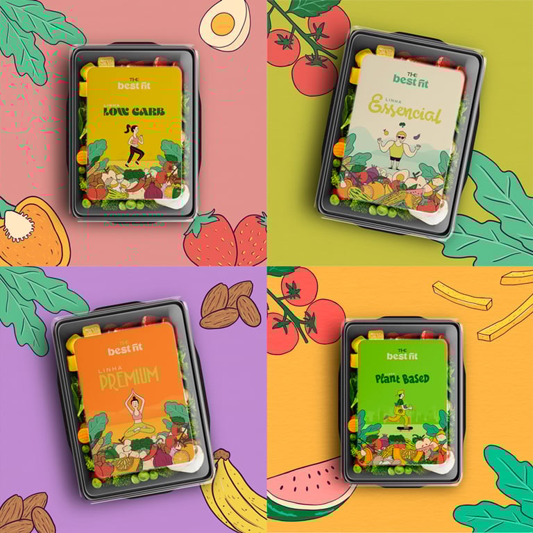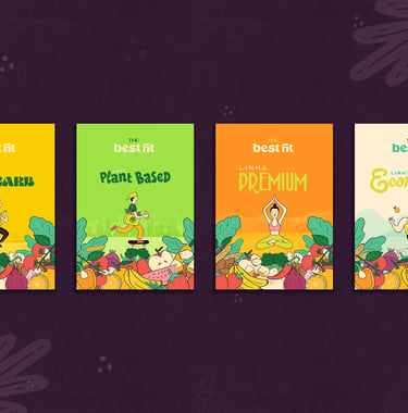 Nosso conceito uniu a essência desses dois pilares, para desenvolver uma identidade visual e embalagens criativas alinhada a todo universo que o público alvo de certa forma está envolvido. Criamos ilustrações que unem de forma lúdica alimentos e práticas esportivas